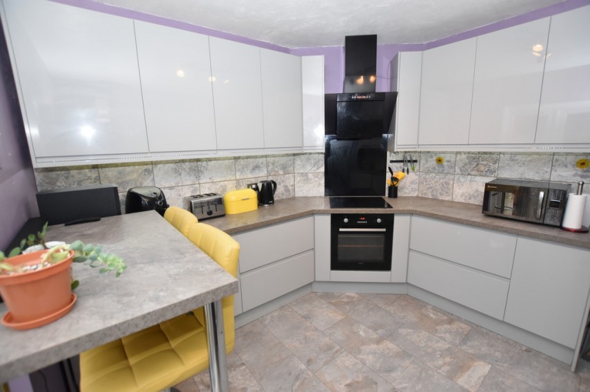 KITCHEN 11' 10" x 10' 7" (3.61m x 3.23m) Measurements to include: Matching grey gloss fitted units, composite sink with mixer tap, integrated dishwasher, electric oven and hob, extractor, marble effect worktops, tiled splashback, space for a fridge/freezer, laminate tiled effect flooring, radiator, double glazed door.